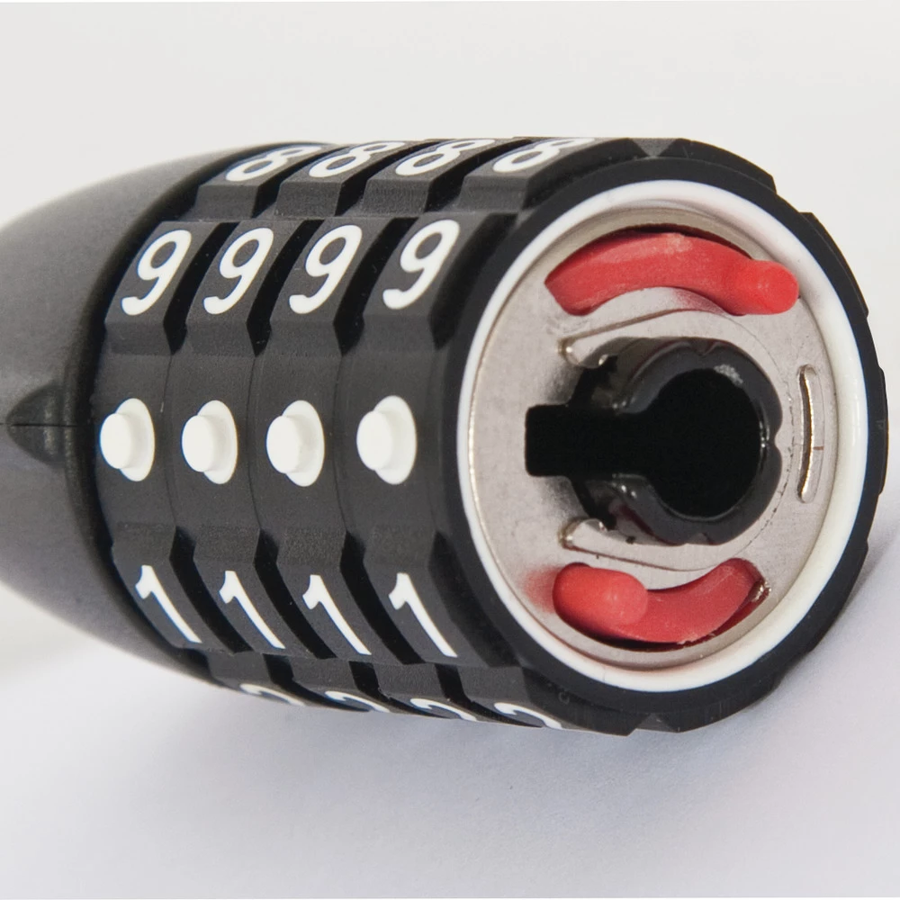 Die überlappenden Stahlhülsen mit 20 mm Stärke umgeben das innere Stahlkabel wie eine zähe Außenhaut aus Metall. Ist der individuell einstellbare Zahlencode einmal gewählt, schließen Sie Ihr Rad mit dem Steel-O-Flex™ Tresor 1360 ohne Schlüssel sicher an. Ein spezieller Abtastschutz erschwert dabei das Knacken des Zahlencodes durch Manipulationen.